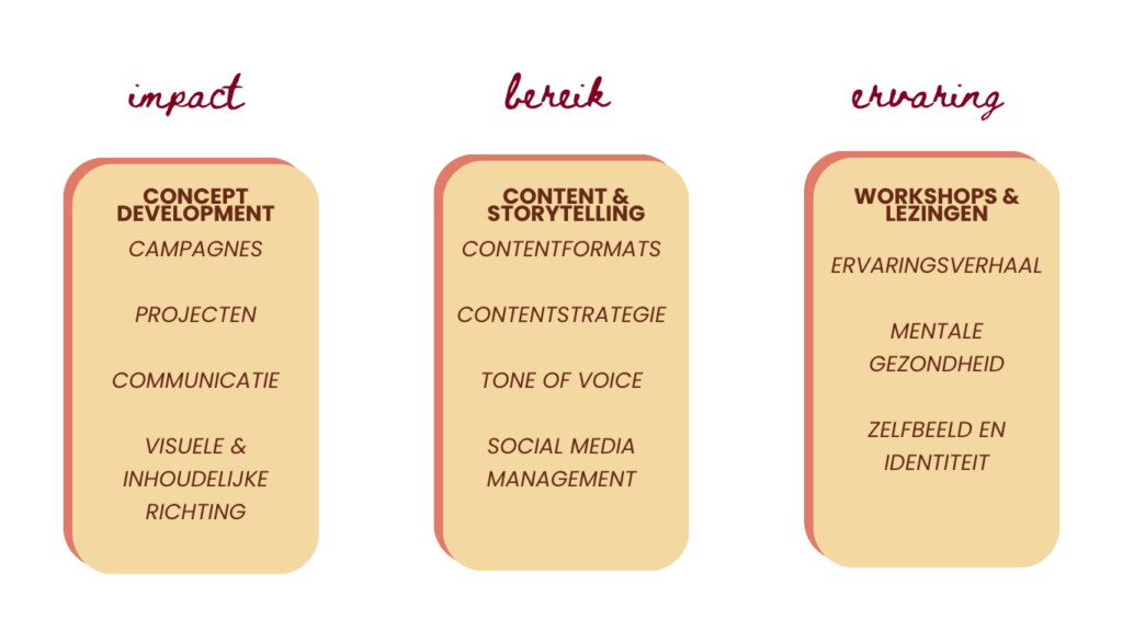 Vanuit mijn Studio ontwikkel ik concepten, campagnes en storytelling die compleet aansluiten bij de leefwereld van jongeren. Mede dankzij een combinatie van ervaringsdeskundigheid, creatief denken en community-building zet ik een project neer wat niet alleen toegankelijk is, maar ook activeert.