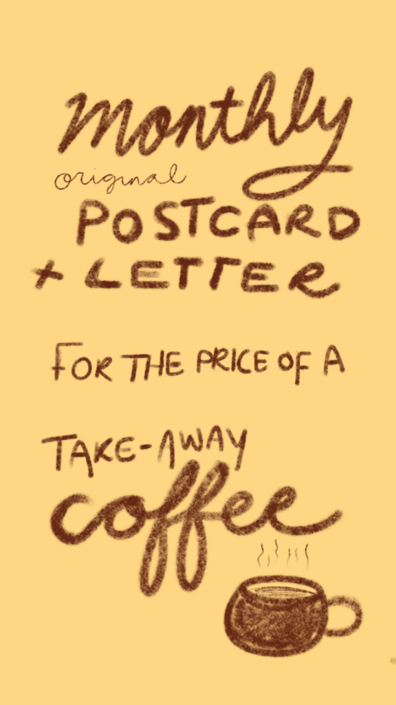 een a6 zelfgemaakte postcard gedrukt op ecologisch verantwoord papier van Paperwise, een lange brief, journal prompts, receptjes en mental health reminders!